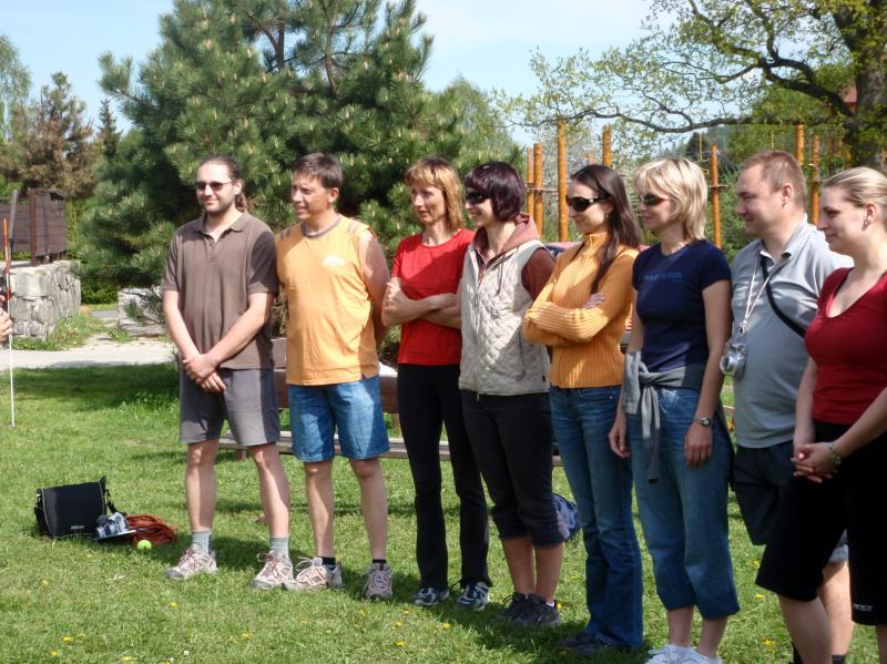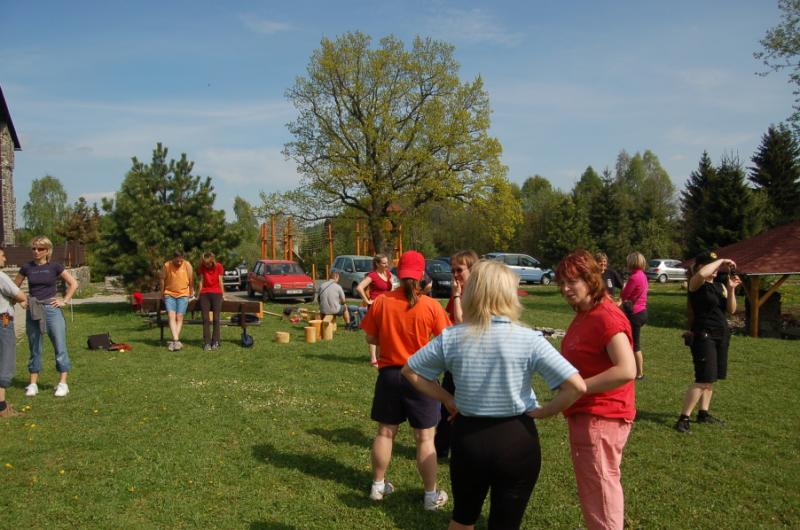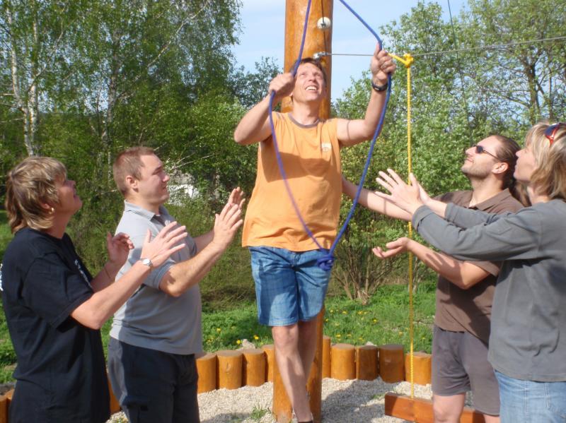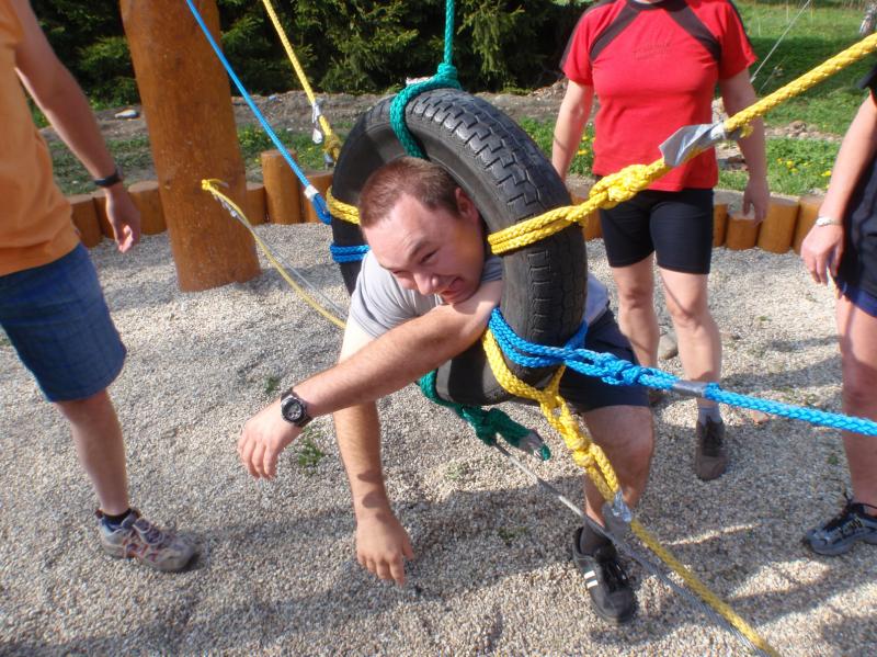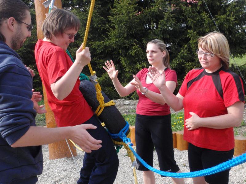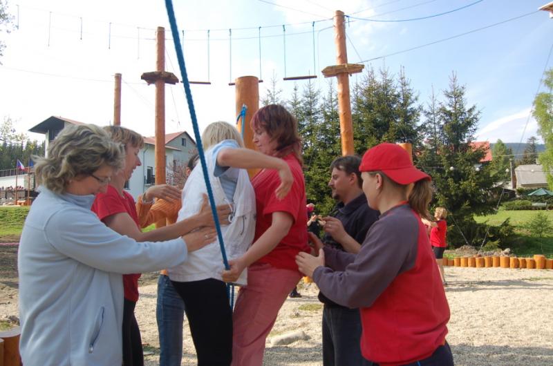 Outdoorové lanové aktivity, které mají vaši žáci možnost si vyzkoušet v našich obou střediscích na školním výletě či sportovní kurzu jsme chtěli dopřát i vám. A došlo na to hned první den. S programem jsme začali sice o něco déle, zato v plném počtu přihlášených účastníků. Pár seznamovaček a týmovek na rozehřátí a šlo se do akce. Začali jsme pozvolna, pouze metr nad zemí a to na nízkolanových aktivitách. Kladina, zauzlované manévry, krocení divokého koně či kočička ( v mužském podání byla lanová překážka přejmenována na divokého kocoura :-)) a spousta dalších. Doplnili jsme síly malým občerstvením a kávou a vyrazili opět do terénu. Přesněji řečeno do vzduchu. První polovina vyrazila na lezeckou stěnu, druhá na vysoká lana. Karabiny drnčely, někomu se v deseti metrech nad zemí klepaly nohy, někomu docházela při uchycení nejvýše usazených chytů na lezecké stěně síla v rukou, ale zvládli jsme to všichni.